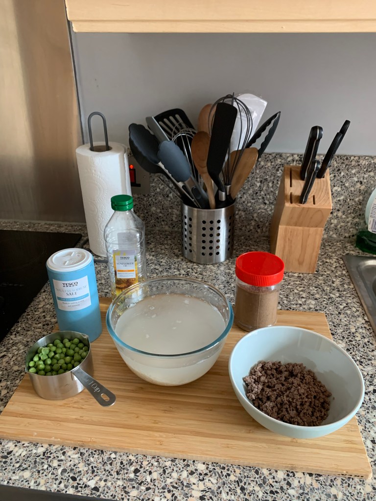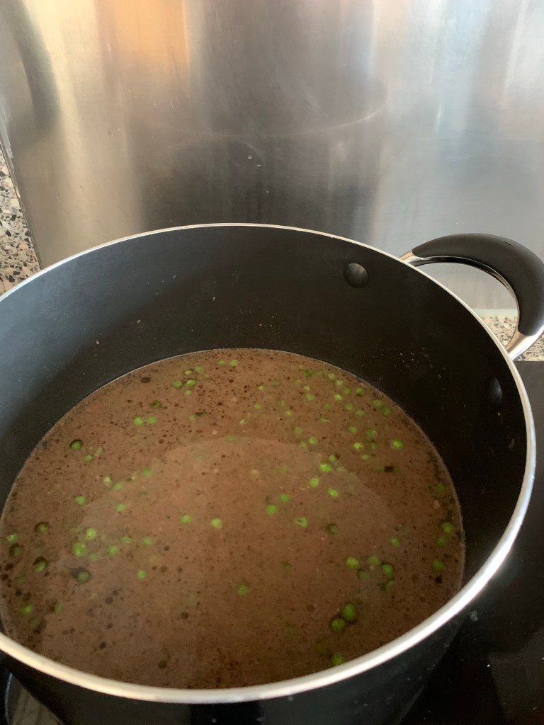 5. Once the peas are cooked through, add the water and a tablespoon of oil.