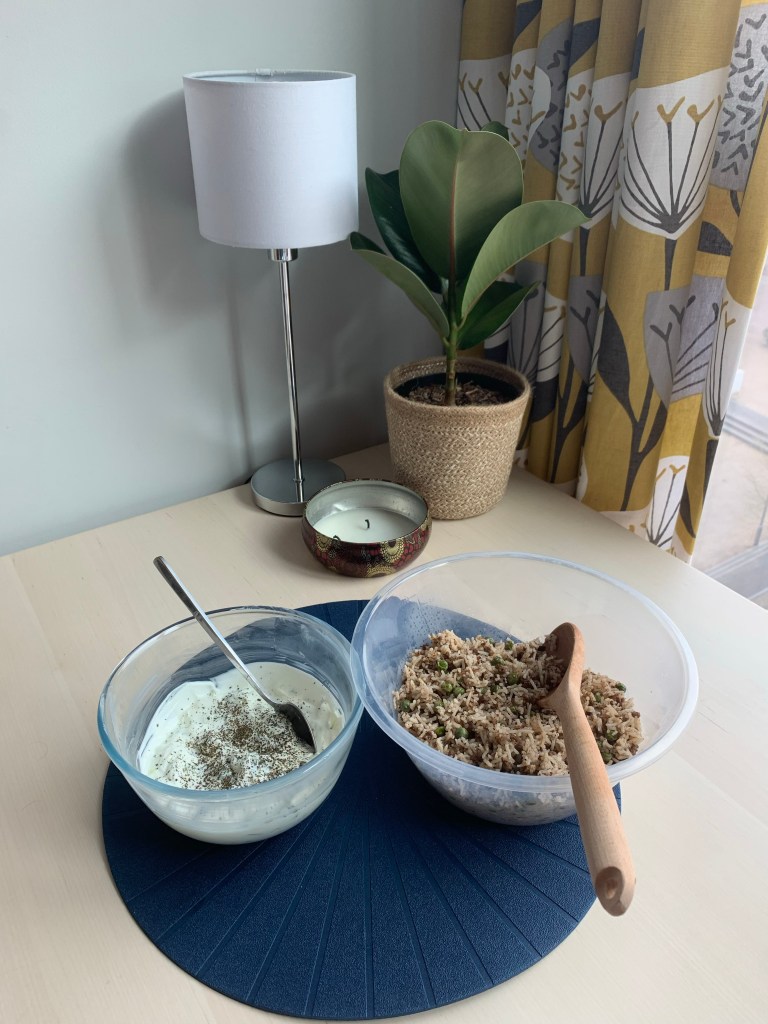 This rice pairs nicely with yogurt and cucumber (tzatziki)- I used greek yogurt, diced cucumber, crushed garlic, and some dried mint.
